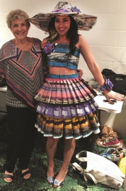 Rachel Adkins, General Manager of the Huron Yacht Club (Huron, OH), read about the event and approached talented HYC member, Ruthann Byrne, about designing a dress to participate in the event. After some brainstorming, it was decided to use Great Lakes Scuttlebutt magazine as the material for the dress due to Huron Yacht Club’s long-standing love of the magazine and distribution to its members. Rachel volunteered to model the dress during the Recycled Runway and together they ended up placing second out of twenty-eight entries!