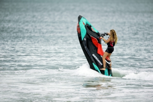The stowage compartment in the bow area has enough room for a 5-gallon dry bag, a waterproof and shockproof pocket for car keys or a phone, and an integrated USB charging port. The add-on extras are where the real fun starts. Sea-Doo introduced their LinQ cargo system with snap-on accessories that attach at the aft end. Bring along an optional 4-gallon fuel caddy for a greater range, a 16-quart cooler, or a dry bag that’s perfect for a towel or a change of clothes. Some of these accessories can be stacked (like the bag on top of the external fuel tank) and the cooler can be moved and used as a small table between the split seats for an on-the-water picnic area. There’s even a quick release ski pylon for towing so whether you want to explore farther, pull a wakeboarder, or run to your favorite beach bar for lunch, you can.