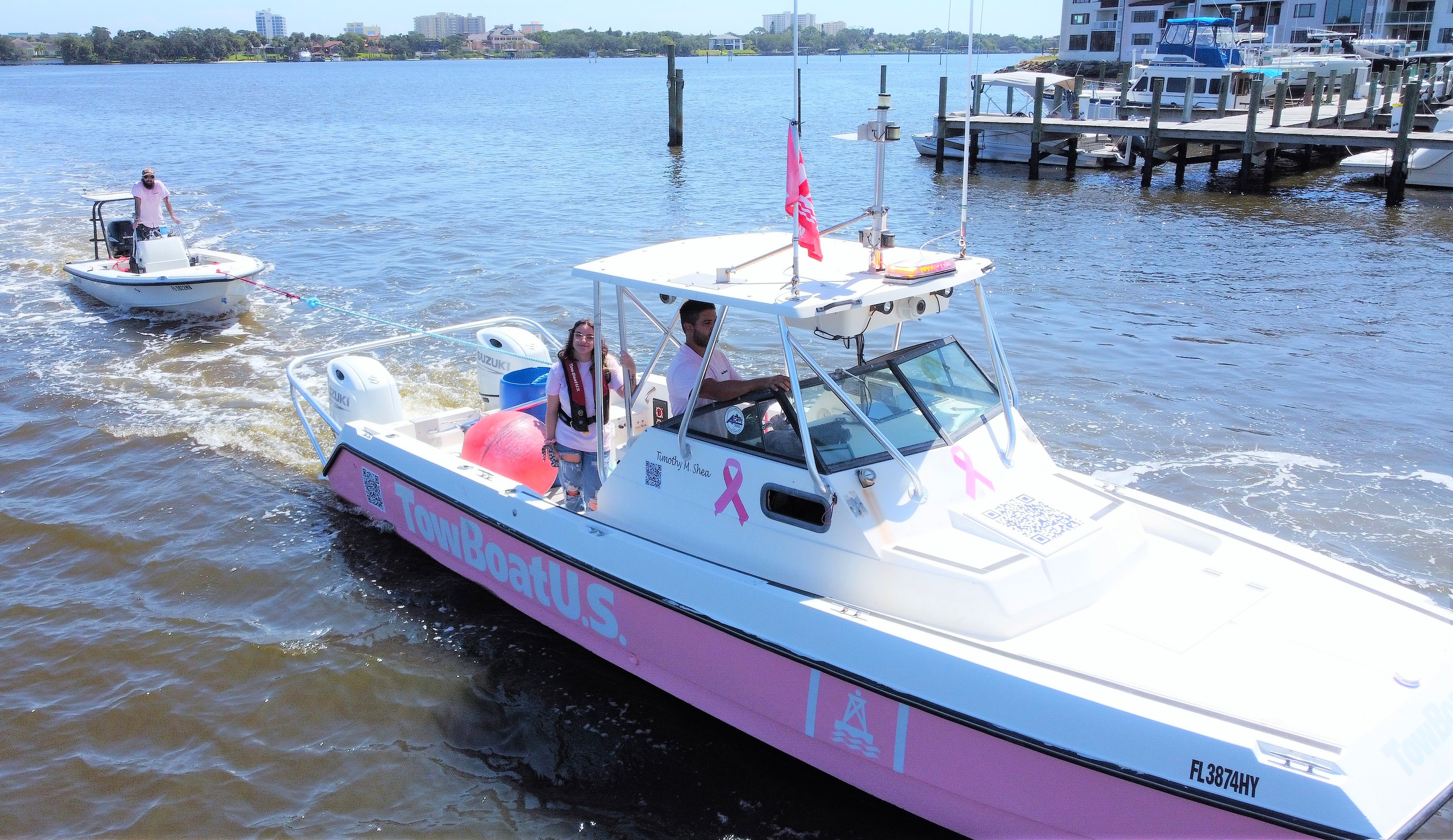 TowBoatUS Daytona crew provides towing assistance with a pink towboat in an effort to raise awareness on the water of the fight against breast cancer.