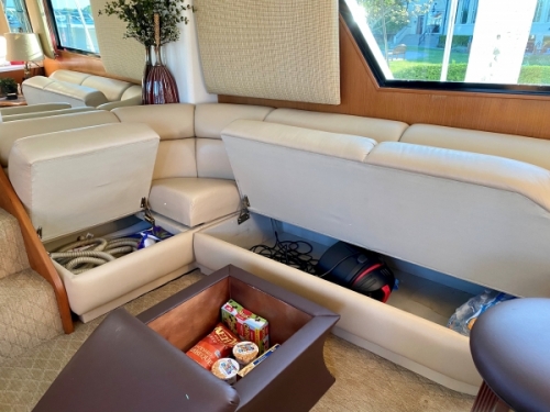 This 1996 Viking 60 Cockpit MY is full of “non-traditional” storage including under the steps, dinette, the aft deck couch & more.