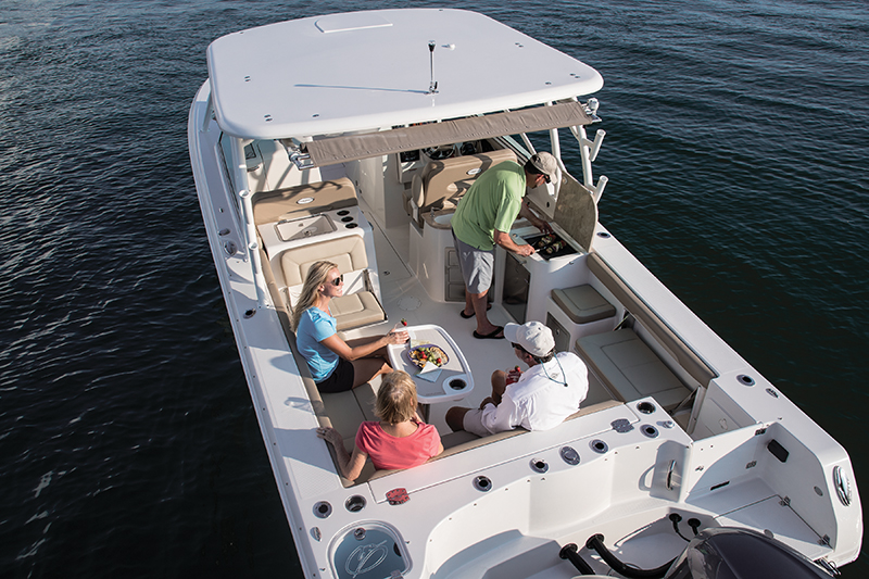If you are a seasoned boater, you’ve surely experienced decks that will not come clean even with the most relentless efforts. Sailfish features a unique dot-matrix nonskid which makes cleanup a snap. Easy to install (and store) removable tables are great for cocktails and meals, and oversized hardtops along with bow and rear cockpit shades provide lots of options for sun reprieve when needed.
