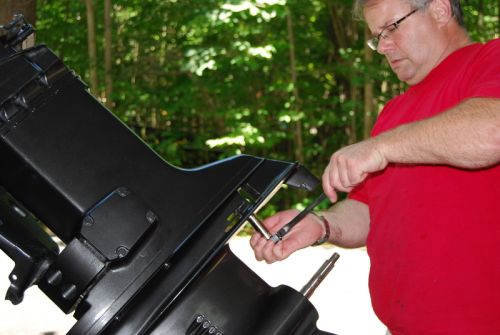 On some outboards, the tricky part of the gearcase removal is disconnecting the shift shaft. For example, on most Mercury and Yamaha engines, the engine should be shifted into forward gear first. On many Johnson/Evinrude outboards, the service manual specifically denotes which gear the engine should be in to make removal and reinstallation easier. Temporarily removing the shift cable at the engine end will make things much easier as well, especially on engines where the shift shaft disconnection is inside the cowling. The engine should be tilted all the way up for gearcase removal.
