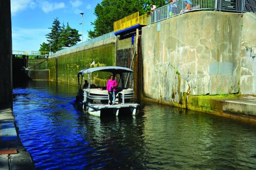 Ranney Falls Flight Lock, just below Campbellford, lifts boaters a total of 14.6 meters (47.75 feet). Three locks overcome Healey Falls. Lock 15 is an individual lift, and Locks 16 and 17 are tandem flight locks. In total, you climb 23.1 meters (76 feet) into Rice Lake.