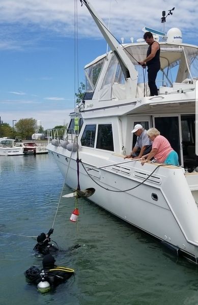 The next day we used the inflatables as tugs to nudge us over to our proper dock. The 2.5” shaft had broken, and the prop had fallen in the water somewhere on the east side of A Dock. Later in September, Bill contacted Deep Six Diving, where he had been certified low these many years ago, and still had his card. Four from Deep Six and Bill dove a whole day and did not find anything. A proper search grid could not be followed as the seaweed was so thick and visibility was near zero.