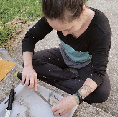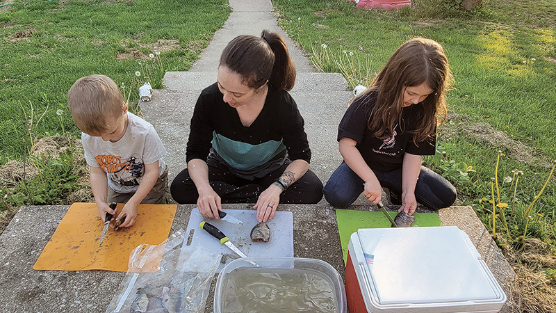 Kira’s focus was on her fish, already gutted and beheaded. She held it in matching reverence but spoke little as she examined the bones, visible from underneath. “Is that its spine?” she asked, pointing. “And those are its ribs?” And although bluegill are bony fish, we talked about how others have skeletons made out of cartilage. This turned into giggling suggestions of ears and noses swimming through our local waters, which then devolved into discussions of boogers... and then somehow Godzilla? I struggled to get attention back to the task at hand.