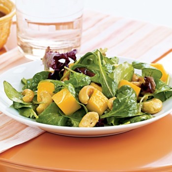 - Combine arugula, mango and cashew mixture in large bowl; drizzle with dressing.