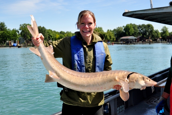 A communications associate holding a lake sturgeon collected on restored spawning grounds in the lower St. Clair River in 2013.