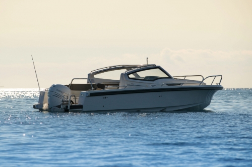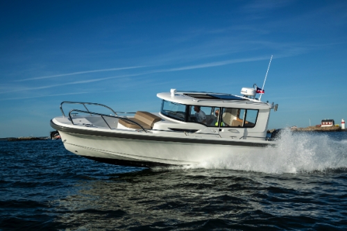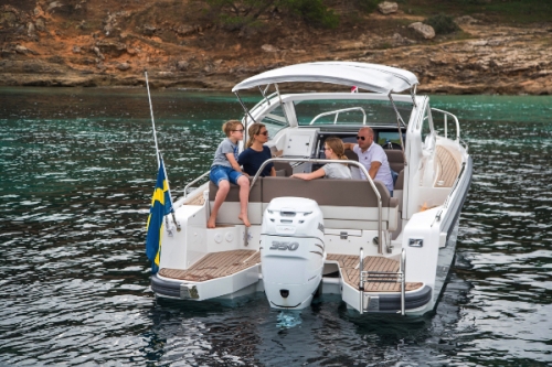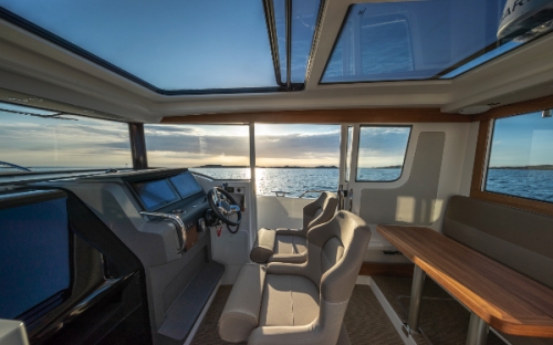 The intention of the design is to ensure that the boat is secure and harmonic at all speeds, to have a minimal planing threshold. Due to its excellent balance, stability, and well-defined flair, the boat remains extremely dry without excessive spray. The cockpit provides protection for everyone on board with a large windshield.