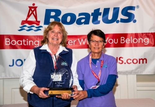 More than 100 women sailors gathered recently at Corinthian Yacht Club (CYC) for the National Women’s Sailing Association (NWSA) 18th annual Women’s Sailing Conference and honored one of their own, Pat Dieselman of Ipswich, Massachusetts, with the 2019 BoatUS/NWSA Leadership in Women’s Sailing Award. The honor recognizes an individual with a record of achievement in inspiring, educating, and enriching the lives of women through sailing. The award was presented by NWSA President Debbie Huntsman.