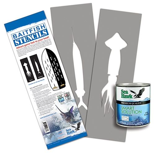 Sea Hawk, the world's leading premium nautical coating brand, announced the release of Baitfish Stencils used for painting baitfish patterns, with Sea Hawk Smart Solution or Mission Bay CSF antifouling paint, onto the hulls of fishing boats. Baitfish designs are applied by professional and sport fishermen to mimic schools of bait and lure larger target fish closer to their boats. The reusable stencils are packed in kits containing both Squid and Ballyhoo baitfish silhouettes.