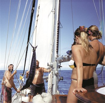 It was a couple years later, when we were sailing into Taha’a in French Polynesia with my friend, Curt. We’d caught a 180-pound Marlin and called a man who ran a small resort on an outlying motu. He said if we brought the fish in, he’d get a local to clean it and trade us a good meal for the fish.