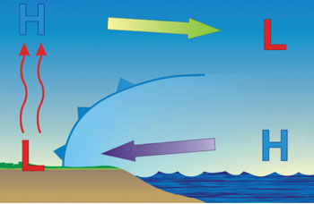 During the day in the summer, and even on some cloudy days, the land heats up much quicker than the water. This sun warmed air over the land rises and creates a weak low pressure area over the land near the shore. Cooler dense air centered over the lake water then effectively becomes a small scale high pressure system over the lake. This cooler denser higher pressure air then heads toward the weaker land based low pressure air to fill in the void caused by the raising land warmed air. This creates a lake breeze. Lake breezes become less intense as the surface water temp increases.