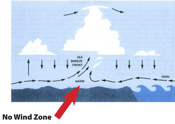 A transition zone is the area where the lake breeze meets the system breeze. This convergence of wind directions often creates an area of little or no wind. This moves around during the day as the lake breeze builds and subsides. You often see a near shore transition zone in the late morning and early evening as the lake breeze forms or dies.